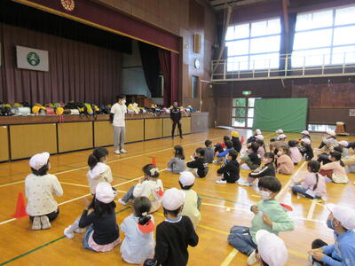 雨天のため体育館での実施となりましたが、子どもたちは元気いっぱい。大きな声でのあいさつでモーモークラブが始まりました。