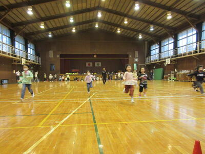 最後は体育館の縦一往復を目標のタイムを決めて同じ速さで走る練習です。競争ではなく長い距離を走る走り方を意識しながら走ります。何回か繰り返すうちに今日学習した走り方に慣れてくるようです。