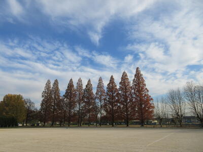青い空と白い雲。校庭のメタセコイアが秋の陽に輝く最高の天気となりました。モーモークラブは先週に続き陸上教室です。