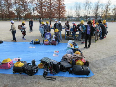 授業が終わり、子どもたちが校庭に集まってきます。荷物を決められた場所に置き、受付を済ませます。実行委員の方に名簿のチェックをしてもらい、シールの名札を付けます。