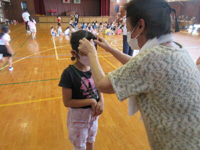 6月27日(月) 牛島小学校放課後子ども教室「モーモークラブ」、今年度第1回目は1~2年生対象の忍者教室です。子どもたちに人気の高い教室の一つです。教えていただくのは春日部おやこ劇場の皆さんです。本来なら子どもたちも左の写真のように風呂敷や布で忍者装束をするのですが 、今回は暑さが厳しいため黒はちまきに「忍」のマークで気分を高めます。
