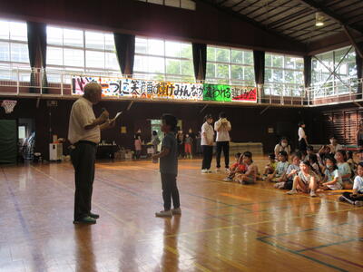 チャンバラ修行が終わると牛島小モーモークラブ実行委員長より「忍者修行 修了認定証」が渡されます。午後の暑い体育館でしたがみんな最後まで修行に励むことができました。