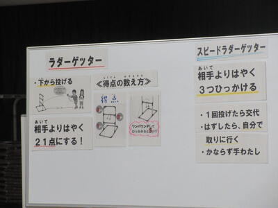 2チームごとの対戦で行います。勝敗決め方は2種類があり、一つは21点ぴったりに先取したほうが勝ち、もう一つは3本の横棒すべてに早くロープをからませたチームが勝ちとなります。隣のチームが競争相手で点数もわかるので勝ち負けでつい熱くなりがちです。しかし、冷静に投げることが得点につながるようです。
