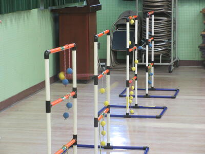 一つ目の会場はラダーゲッターです。ラダーゲッターは、両端にボールがついたロープ紐を投げ、高さの異なる3本の横棒の的にからませる競技です。これがなかなかうまくいきません。それだけにうまくからまった時は大喜びです。