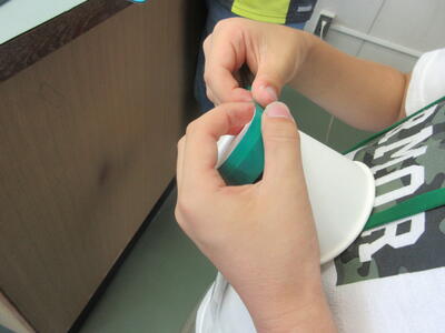 紙コップの底を切り取り、そこのふちにビニールテープを何回も巻きます。テープは一周分の長さを先生が切って用意してくれています。テープの重さがよく飛ぶポイントのようです。紙コップには思い思いに絵や模様を描いてたのしく飾ります。