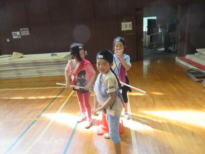 対戦チームは「光」対「風」。斬られない工夫は相手が来たら座り込むこと(足がねらえない)らしいです。子どもたちがねらいやすいのは棒立ちの大人のすねです。斬られたときは味方のタッチで復活です。