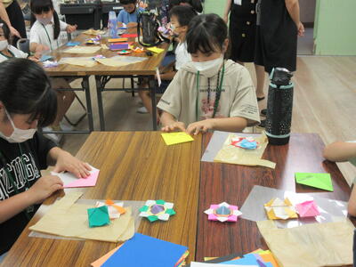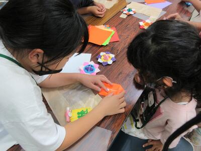 高学年の女の子が集中して折り紙に向かっています。作り方がわかった子は低学年に教えてあげる姿もみられます。