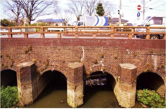 規模は、長さ(川幅)約10メートル、幅(川流方向の長さ)約5メートル、アーチ径約1.9メートル、 翼壁(よくへき)(下流部のみ残存)3.5メートルとなっています。 欄干など上部は改変されていますが、下部構造は建設時のままです。 特に左岸の壁面(翼壁)の上部はレンガの角の部分をのこぎり状に装飾した「角出し(かくだし)」と 呼ばれる装飾が施されています。