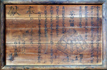 算額(さんがく)とは、和算(わさん)と呼ばれる日本古来の数学の問題を、神仏の加護によって解けたことを感謝して奉納された額のことをいいます。この算額には立体に関する問題と解答、弘化2年(1845)の年号、和算の先駆者、関孝和(せきたかかず)の流れをくむ岡田暉政の門人、中田善次郎政邦の名が記されており、当地において和算が普及していたことがうかがわれる貴重な資料です。