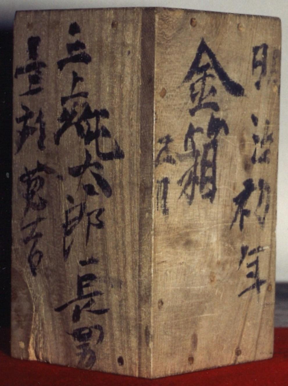 | 解説 | この金箱は、『雪之丞変化(ゆきのじょうへんげ)』などの作品で知られる、春日部市木崎出身の昭和初期のベストセラー作家、三上於菟吉の家で実際に使われていたものです。三上家の箪笥は二つ重ね上開き型で、江戸時代に多く見られる形式の箪笥です(図1)。箪笥の上段の鍵付きの小抽斗(こひきだし)の奥には金箱があり、その側面には「三上純太郎長男 三上於菟吉」「明治初年 金箱 五月」と墨の落書きがあります。これは於菟吉本人が書いたものです。 |