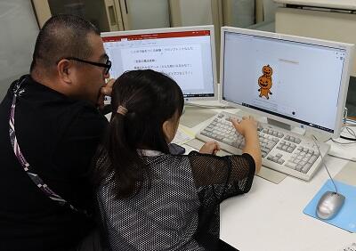 休憩をはさんで、後半は、インターネットからイラストをさがし出す方法やそのイラストをコピーしてプレゼン画面に貼り付ける方法、画面切り替えの設定等を操作をしながら学んでいただきました。
