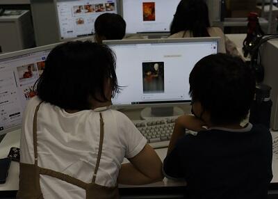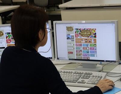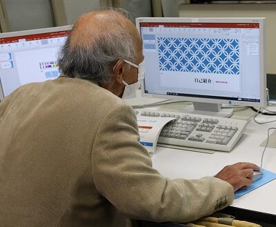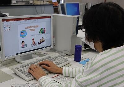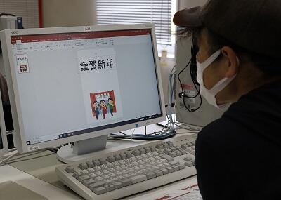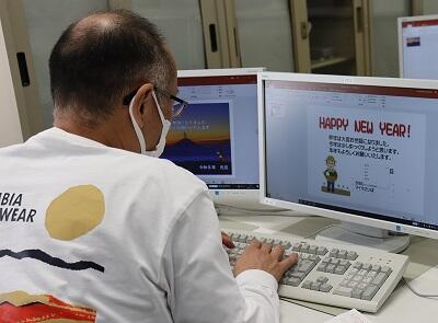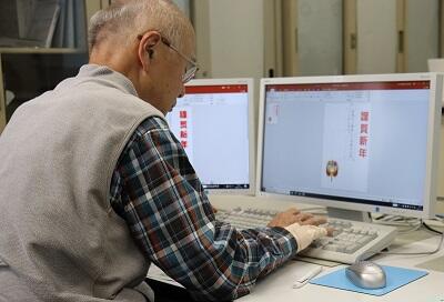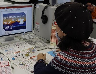 受講生の皆さんは、画面に集中して取り組まれていました。インターネット上からイラストや画像を探したり、こちらで用意した素材を使ったりして思い思いの年賀状を作成していました。