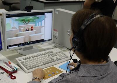 終盤には、3人1組で順番に主催者体験をしていただきました。画面を見ながらヘッドセットごしの会話でしたが、何回もIDやパスワードを入れる作業をすることで、だんだんオンライン会議への入り方が何を見ないでもできるようになっていきました。