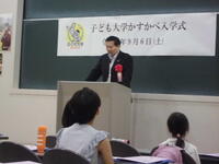 9月7日(土)、春日部新庁舎ひだまりホールで行われた入学式で、須田学長兼実行委員長は、「大学での学びの特徴は『なぜ?どうして?』といった疑問をもちながら、探究することです。子ども大学では『はてな学』『ふるさと学』『生き方学』の3つの分野で、体験し楽しく学んでください。」と入学生を歓迎しました。