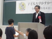 最後に、代表児童からの「ほかの小学校のみんなと交流しながら、子ども大学で楽しく学んだことを、これからの生活で活かしていきたいです。」という言葉を受け、主催者から「これからも学ぶことの楽しさを忘れずに、知的探究を続けていってくれることを期待しています。」と、お祝いの言葉が贈られました。