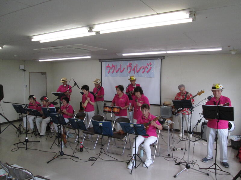 前列には女性7名、後列には男性5名の総勢12名で編成されました。昭和歌謡から懐メロ、ハワイアンの名曲まで幅広いレパートリーを演奏とコーラスで披露していただきました。