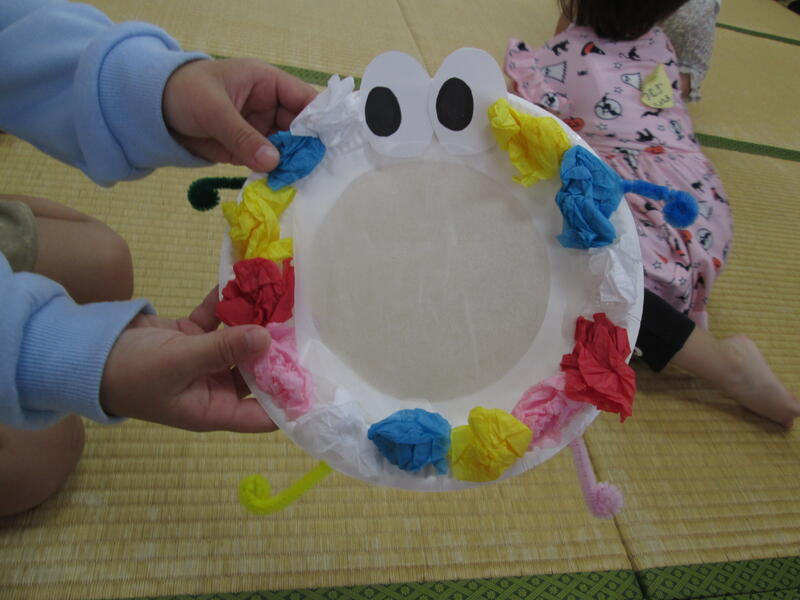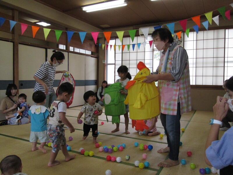次は、「おっかけ玉入れ」黄色い「ひよこさん」、みどりの「カエルさん」の口にボールをポーン