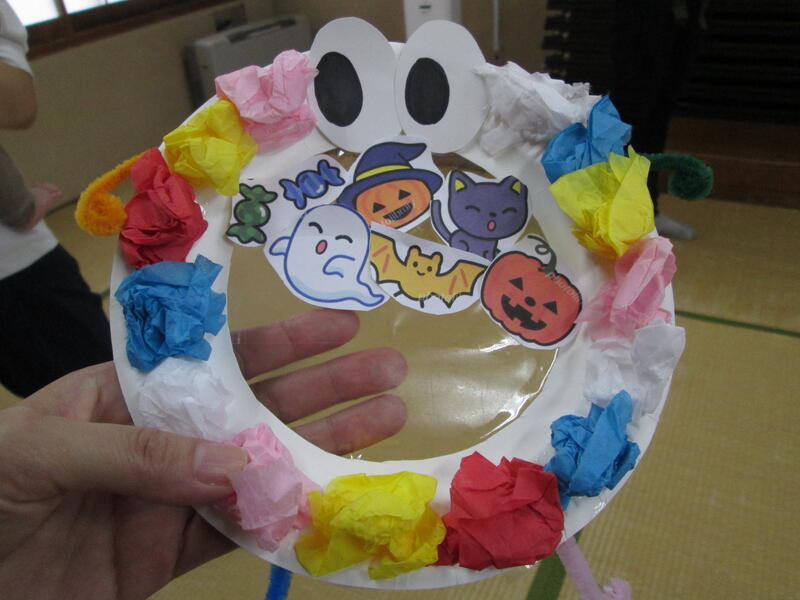 先生お手製のかわいい紙皿 ゴーストにハロウィンキャラクターを集めて貼っていくと、オリジナルのリースになります。ママもこどもたちもシール集めに必死