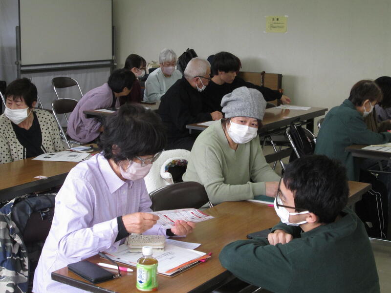 午前・午後の部とも参加者2名に学生が1名付き、それぞれ教えてもらいます。講習は静かだったのに、いざ各質問タイムに入ると賑やかやどり木の皆さんが丁寧、親切にわかりやすく説明してくれるのを、参加者は真剣に聞き入っています。
