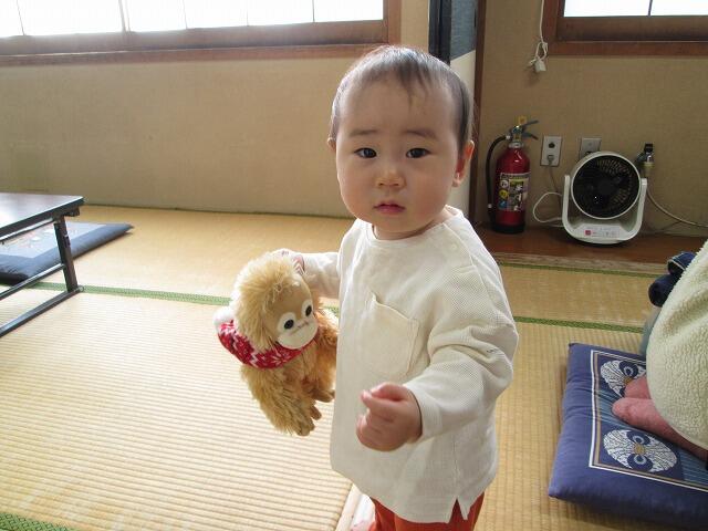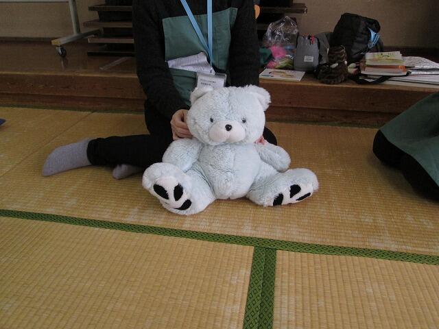 かわいいモンキーのぬいぐるみを連れて参加です。大きなクマのぬいぐるみがお出迎え