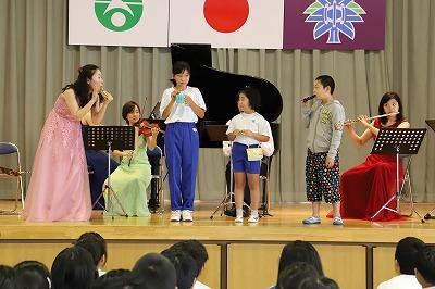 音楽ワークショップ2回目。校長先生の「あちこちから登場します。」というお話しの通り、後ろや前から演奏者が登場し、楽しい雰囲気で始まりました。演奏をしっかり聴いて、いろんな笛を使って演奏したり、指揮者の体験をしたりして、あっという間に1時間が過ぎてしまいました。