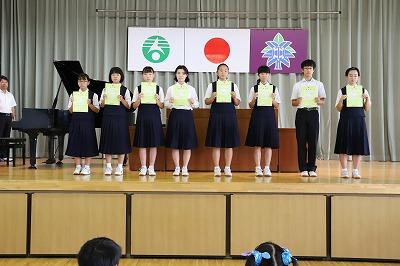 江戸川小中学校が開校して、平成31年が令和になり、様々なことが初めての学期が無事終了しました。終業式では、ジュニア、ミドル、ハイを代表した児童・生徒の意見発表と校長先生のお話し、校歌斉唱がありました。そして、修了式の後、多くの児童生徒に表彰を渡しました。本日の校歌斉唱をお聞きください。