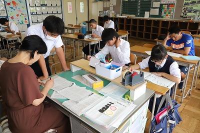 今日は、本格的に夏になった感じ、が~んっと暑さがやってきました。でも、教室は自主学習するのにちょうど良い室温です。水泳学習の後の学習でしたがしっかり学んでいました。後期課程の生徒も丸付けや支援をしっかり行っていました。