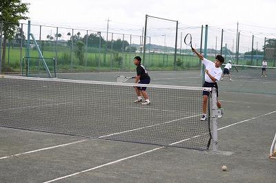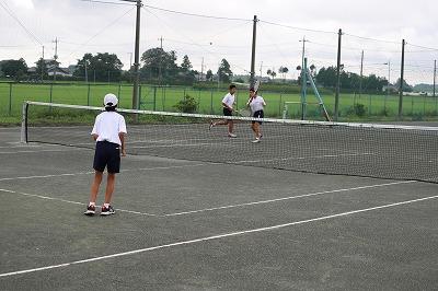 校庭から校舎をみると、すきっとした青空が広がり、日ざしが強い。そんな中、校庭では男子ソフトボール部が、体育館では女子卓球部が活動していました。とっても暑かったので予定より早めに活動を終えました。