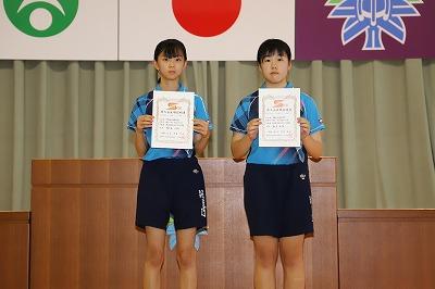 学総大会女子卓球ダブルス戦で市内優勝した2人が県大会で健闘するよう壮行会を開催しました。壮行会では、生徒会本部役員がつとめる応援団のふりに合わせて、5年生から9年生が拍手と声援を送りました。その後2人から「これまで支えていただいた方に感謝します。県大会で4位以内を目指します。春日部市の代表として恥じぬよう大会までの時間を大切にして練習し、成果を出せるよう頑張ります。」とお礼と決意の言葉がありました。