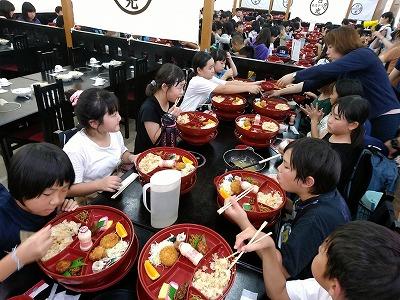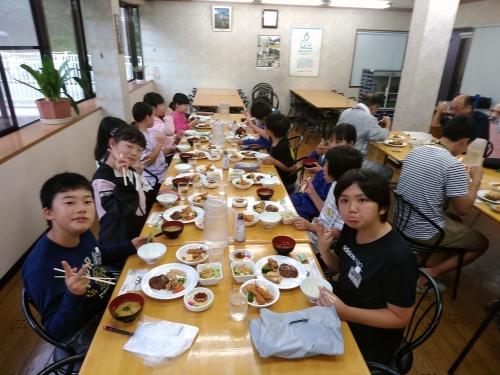 お風呂に入ってさっぱりして、夕食の席に着きました。しっかり食べて、キャンプファイヤーと明日のハイキングに備えます。