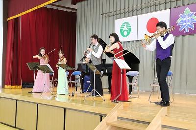 音楽ワークショップ2回目。校長先生の「あちこちから登場します。」というお話しの通り、後ろや前から演奏者が登場し、楽しい雰囲気で始まりました。演奏をしっかり聴いて、いろんな笛を使って演奏したり、指揮者の体験をしたりして、あっという間に1時間が過ぎてしまいました。
