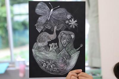 8年生が美術の作品作りに取り組んでいます。教室は作品づくりに夢中でニードルの音がカリカリと聞こえます。黒の中に白い線や面が光りとっても神秘的でした。何人かに協力してもらい写真を撮らせてもらいました。ご覧ください。夏休みに仕上げをして、2学期には色がつくそうです。どんな作品になるか楽しみです。