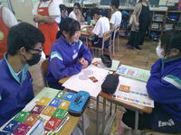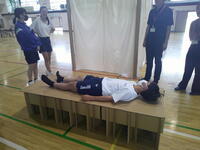 8年生は、ハザードマップと段ボールベッドづくりを体験しました。万が一、災害級の洪水となった時を想定してのハザードマップ作りでは、自分の家は安全なのか等、具体的に知り、対策を考えました。防災の基本は「自助」です。まず、自分自身の安全を第一にしながら、その上で、身近な人を守るために、そして、周りのだれかを支えるための「共助」について学びました。