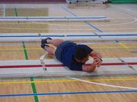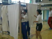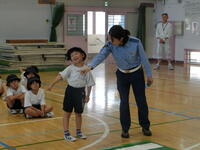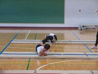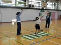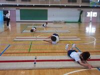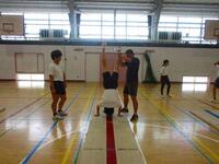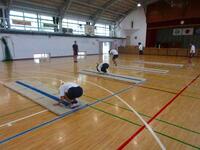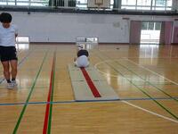 体育館でマット運動を行っていました。だんだんと難しい技に挑戦していました。
