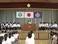 今日は、全校朝会が行われました。校長先生のお話がありました。今日は開校記念日です。7年前の今日、宝珠花小、冨多小、江戸川中の3校が一緒になるための新しい校舎、ジュニア棟ができた日、落成式が行われた日です。