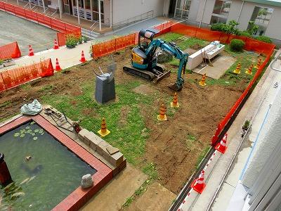 江戸川小中学校では、ジュニア棟と体育館、職員室の南側に囲まれた場所が芝生化されます。昨日より芝生化に向けた工事が始まりました。
