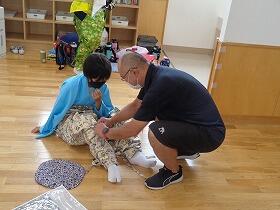 そこで、熱中症対策のため激しい動きは控えて、場所や動きの確認を中心とした練習にしました。また、20分間で外での練習を切り上げました。