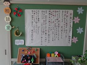 現在、さわやか相談室には折り紙がたくさん掲示されています。児童生徒がきれいに作ってくれました。クリスマス用の掲示もしてくれています。また、毎月の詩として、12月は、細渕季之さんの「思い出いっぱいのカレンダー」が掲示されています。「誰もいない教室は冷えている。一人二人みんなが入ってくると温かくなる。居心地がよくなる。(一部抜粋)」これからも温かい教室で、みんなで生活をしていきましょう。
