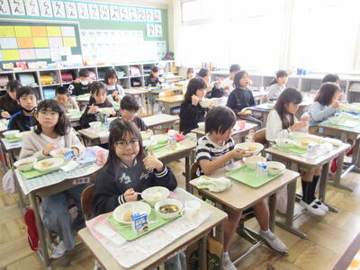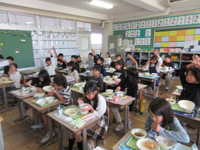 3日(水)2年生の大根ほりの際にいただいた大根が4日(木)の給食で「のっぺい汁」の具材として登場しました。寒い日に心も体もぽかぽかです。大根ほりをした2年生もたくさん食べました。