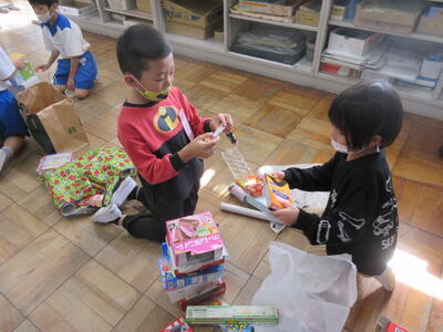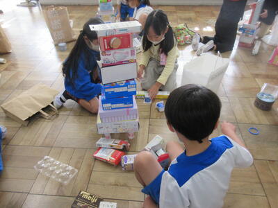 1年生の算数は「はこの形」の学習です。おうちの皆様にご協力いただき、色々な形や大きさの箱が集まりました。どんな順番で、どうやって組み合わせたら高く積めるかな?試行錯誤、アイデアを出し合いながらの学習です。