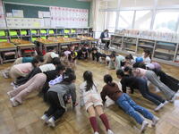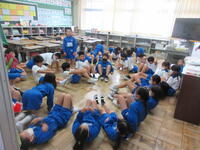 エアコン工事のため、体育館に集まれないため、放送を使って各教室で児童集会を行いました。各教室では子どもたちが輪になって座り、計画代表委員の児童がゲームの内容を放送で説明すると「爆弾ゲーム」のスタートです。音楽に合わせてボールを受け渡していき、音楽が止まった時にボールを持っている児童、その両隣の児童、ボールを持っていない児童などが、計画代表委員の指示で腹筋をしたり、腕立て伏せをしたりしながら爆弾ゲームをしました。楽しい時間をみんなで休できただけでなく、今月の生活目標「すすんで体をきたえる」こともできた、児童集会でした。