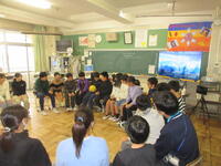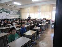 冬の交通事故防止運動が始まった12月1日、朝の時間を使って全校朝会を行いました。体育館のエアコン工事のため、今月もオンラインで校長室と各教室をつないで行いました。今月は特に交通指導員さんにおいでいただき、安全な登校と下校の仕方についてお話してもらいました。