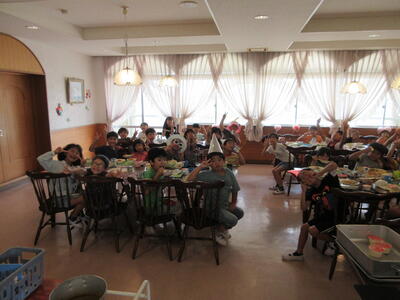 林間学校2日目も青空にめぐまれました。子どもたちはそれぞれの部屋でゆっくり過ごしあたと、おかずいっぱいの朝食を食べました。いただきますやごちそうさまのあいさつをする児童は、それぞれ自分の気持ちを添えて気持ちの良い挨拶をしてくれました。また、数日前に誕生日を迎えた児童に、全員で誕生日の歌を歌うサプライズもありました。