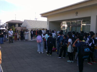校舎内に不審者が入ってきた場合、安全をどのように確保し、不審者にどのように対応するかを学ぶため、春日部警察の方を指導者に、不審者対応避難訓練を実施しました。不審者役の警察官の方が、大声をあげて6年1組の教室に入っていくと、6年生は真剣にすばやく避難をしていました。他のクラスでは、不審者が教室に入ってこないよう、バリケードを作って教室の中で避難をしました。初めて取り組んだ訓練でしたが、実際に110番通報も行い、緊張感あふれる訓練になりました。