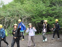 フィールドセンターの屋外の森には、何気ない松の林の中に1000年ほど前の噴火で流れでた溶岩が大木を囲み、その大木の形だけ残して冷えて固まったトンネルがたくさんあります。それが溶岩樹形です。たて型、横型、ななめなどさまざまな形をして人が通れるほどの溶岩樹形もあります。溶岩樹形の中は外が30度近いにもかかわらず真夏でも10度。子どもたちは寒さにも驚きながら1000年前にできたタイムトンネルを探検しました。