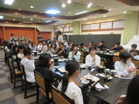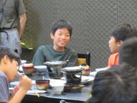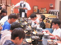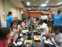 昨年から1泊2日になった林間学校。みんなで夕食を食べる機会はこの日だけかもしれません。陶板でやきたてのハンバーグ、茶碗蒸し、エビフライなど、大人も子どもも大好きなものが出され、たくさんの児童がご飯のおかわりをしていました。
