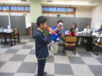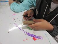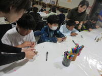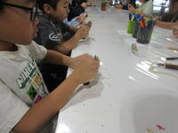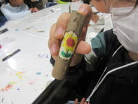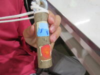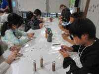 林間学校二日めの最初は、富士山の樹海にあるフィールドセンターでバードコールづくりです。小枝に金属を埋め込み、それを回すと小鳥の鳴き声のような音がします。それがバードコールです。本体の小枝の樹皮を小刀で削り、おのおのお気に入りのイラストを描きます。初めて使う小刀に苦労しながらも、短い時間でバードコールを作りあげ、きれいな音色を響かせていました。