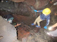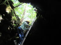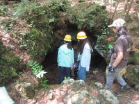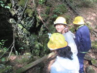 フィールドセンターの屋外の森には、何気ない松の林の中に1000年ほど前の噴火で流れでた溶岩が大木を囲み、その大木の形だけ残して冷えて固まったトンネルがたくさんあります。それが溶岩樹形です。たて型、横型、ななめなどさまざまな形をして人が通れるほどの溶岩樹形もあります。溶岩樹形の中は外が30度近いにもかかわらず真夏でも10度。子どもたちは寒さにも驚きながら1000年前にできたタイムトンネルを探検しました。