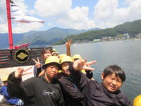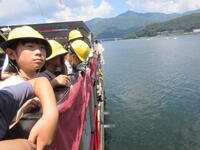 林間学校最後のプログラムは河口湖クルーズ体験です。乗った船の形は、戦国時代に武田信玄が駿河の国(静岡県)に進出した際に創設した水軍の軍船を模した形です。ほら貝の音を合図に出港し、水面を渡る涼しい風に吹かれながら、河口湖大橋の下をくぐり、御坂山脈や富士山を眺めました。モーターボートに乗っている人が手を振ってくれて、こちらからも振り返す場面もありました。1泊2日の短い時間でしたが、時間を守りながらすばやく行動し、多くのことを体験できた充実した林間学校になりました。