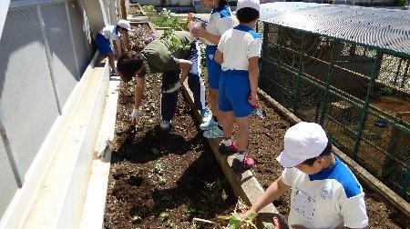 備後小学校では、学校ファームとして校内の花壇のスペースを使っていろいろな作物を作っています。